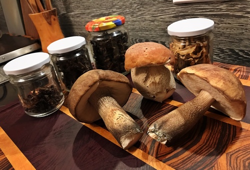 Foto: Zwei Pappelraufüße und ein Steinpilz in der Mitte. Im Hintergrund sehen wir die getrockneten Steinpilze und Totentrompeten, die Stefan aus seinem Urlaub im Nassfeld/Österreich mitgebracht hat. (Foto © Stefan)