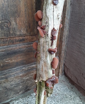Foto: Dass Anna die Äste vor dem Häcksler rettete, zahlt sich nun aus. Das Totholz, vermutlich Holunder, dankt es ihr mit Gaben von Judasohren.