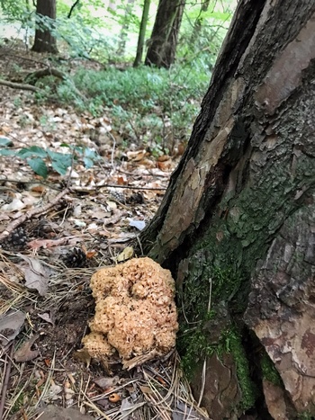 Auf dem langen Rückweg, der mich durch eine an sich ideale Pilzgegend führte, fand ich schließlich am Fuße einer Kiefer noch eine schöne Krause Glucke. Diesen Fund verdankte ich meiner Erfahrung, denn ich hatte hier schon vor Jahren solch einen prächtigen Pilz gefunden und ließ meinen geschärften Pilzblick entsprechend schweifen.