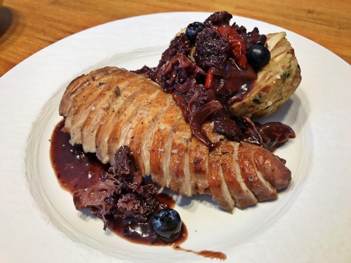 Foto: Krause Glucke an Truthahnfilets mit einem eigenen Saucenansatz inklusive Gartenbirnen und selbstgemachten Semmelknödeln. Stefan schreibt: »Wegen der fünf Truthahnfilets war die Pfanne recht voll und alles etwas zusammengedrängt. Deshalb würde ich beim nächsten Mal die Sauce und die Truthahnfilets separat zubereiten. Geschmacklich war es fabelhaft!« (4 Fotos © Stefan)