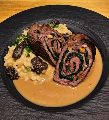 So gab es heute für die ganze Familie Rinderrouladen, gefüllt mit jungem Spinat, frischem Basilikum, Pinienkernen, geschmorten Schalotten und Zwiebeln. Dazu zweierlei Risotto, einmal klassisch und einmal mit Spitzmorcheln, wie das Foto rechts zeigt.