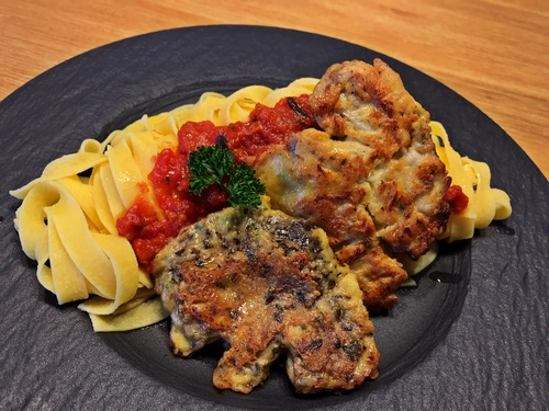 Ich habe daraus eine Pilz-Piccata daraus zubereitet. Klassisch werden hierzu dünne Kalbfleischscheiben erst in Mehl und dann in einer Parmesan-Ei Mischung gewendet und anschließend ausgebacken. Dazu wird eine Pasta mit Tomatensauce serviert.