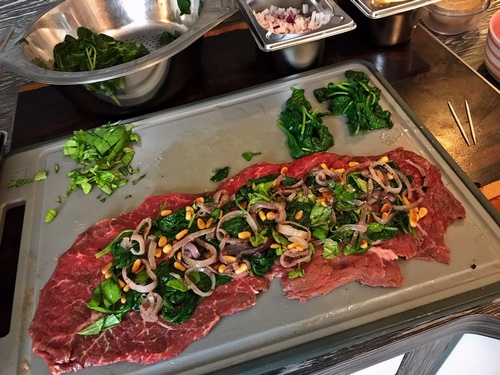 Foto: Eine Roulade mit Füllung: Blanchierter Spinat, Basilikum, geröstete Pinienkerne, geschmorte Schalotten und Zwiebeln.