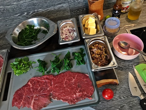 Foto: Die vorbereiteten Zutaten für das Füllen der Rinderrouladen stehen bereit.