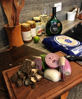 Foto rechts: Ein kleiner Überblick über die Hauptzutaten: Fond, Reis, Schalotten, Zwiebeln, Öl, Spinat, getrocknete Spitzmorcheln und Safranfäden (für das klassische Risotto). Fabiano hat sich noch einen Schluck aus dem Bocksbeutel gegönnt ;-)
