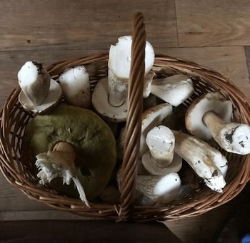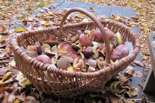 Foto: Im Korb herrschte Gedränge, aber für den Steinpilz (hinter dem Bügel) war noch genug Platz. Und Peter war's zufrieden. (Foto © Peter)