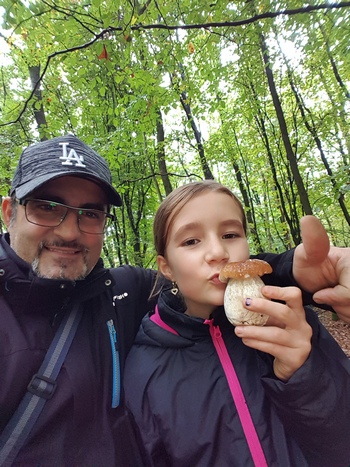 Foto: Und wieder war es für Piero, diesmal mit der ganzen Familie, ein toller Fund im Hochtaunus. Als Rarität fand es diesmal keinen 982-Gramm-Steinpilzriesen, sondern ein Trio von drei reinweißen Steinpilzen. Auf dem zweiten Foto sehen wir Piero mit seiner Tochter, die dem knorrigen Steinpilz wohl ein Küsschen verpasst. (4 Fotos © Piero/Privat)
