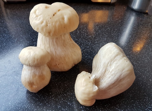 Foto: Diese drei Weißen Steinpilze ließ sich Piero mit italienischem Olivenöl roh schmecken. In der Genetik gleichen sie vollkommen Boletus edulis, dem Fichtensteinpilz. Eventuell geht ihre Andersartigkeit auf exklusive Mineralisierung des Erdreiches zurück. Einen mit Sicherheit extrem seltenen Steinpilz hatte am 22. September 2017 Pilzfreund Armin bei Triftern/Niederbayern gefunden: er hatte eine reinweiße Huthaut, ansonsten aber alle Farben des gewöhnlichen Fichtensteinpilzes.