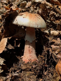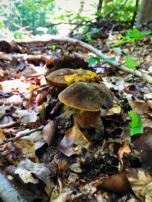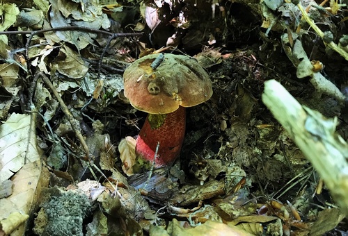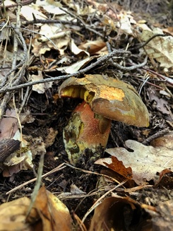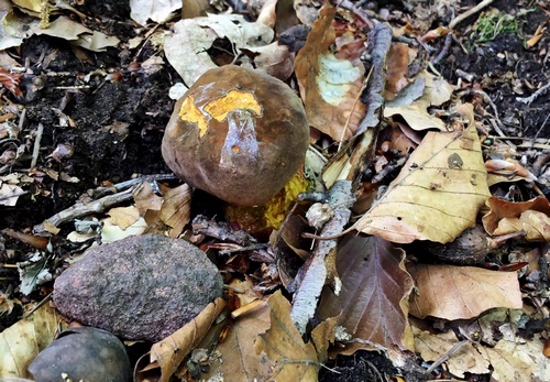 Dabei heraus kam ein fröhliches Einsammeln von zwar jungen, knackigen aber leider auch schon stark vom Schneckenfraß gezeichneten Flockenstieligen Hexenröhrlingen. Schön war, dass ich an jedem meiner Plätze, wo sie meist schon etwas früher im Jahr erscheinen, auch was vorgefunden habe.
