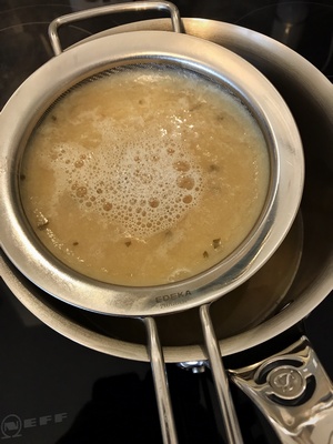 1. Foto rechts: Durch das Passieren durch ein feines Sieb wird die Spargelcrème von