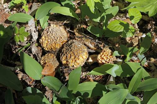 Foto: Peter dachte, für die Speisemorcheln sei es im Raum Wetzlar noch zu früh, doch er und seine Frau mussten feststellen, dass sie besser eine Woche eher gekommen wären. Sie fanden überwiegend ausgewachsene Exemplare vor, die von der Sonne und Trockenheit schon gezeichnet waren. Sie sind hier nicht von Bärlauch, sondern von Maiglöckchen umgeben.