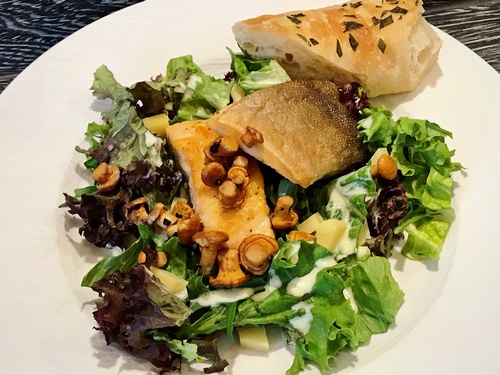 Foto: Die Pfifferlinge fanden beste Verwendung zu einem herrlichen Gartensalat mit Parmesandressing und Stücken vom Bachsaibling. Dazu gab es Fougasse-Brot, eine südfranzösische Brotart, deren Teig dem Baguetteteig nahe kommt.