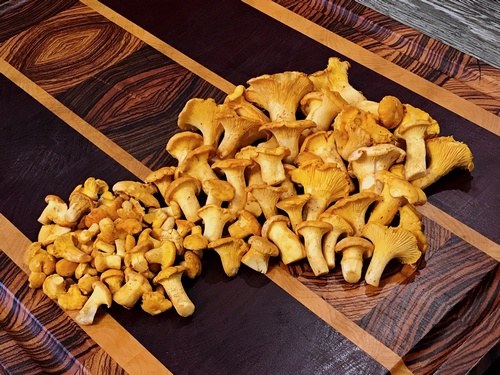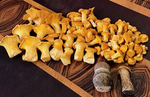 Foto: Die Pfifferlingsgründe tragen gut! Stefan konnte bei seiner Nachlese wieder schöne Exemplare mitnehmen. Ein Hainbuchen- und ein Pappelraufuß kamen noch hinzu. (3 Fotos © Stefan)