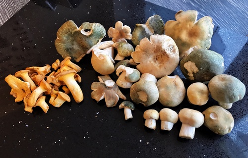 Foto: Die Nachlese in seinem Täublingsparadies im Main-Kinzig-Kreis hat sich gelohnt, Stefan konnte wieder einige sehr schöne köstliche Grünfelderige einsammeln. Auch die Pfifferlinge meinen es trotz der Trockenheit weiterhin gut mit ihm. (3 Fotos © Stefan)