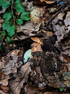 2 Fotos: Einer der Grüngefelderten Täublinge hatte sich gut versteckt (Foto links) und vermittelt uns einen Eindruck, wie schwer sie mitunter im tiefen Laub zu finden sind. Das rechte Foto zeigt den gleichen Pilz, nachdem Stefan ihn freigelegt hatte. Ein prächtiges Exemplar! In seiner Form gleicht der Hut im Übrigen einem jungen Karbolegerling, dessen Hutumrisse ebenfalls gerne eine kubische (würfelartige) Form haben oder andeuten.