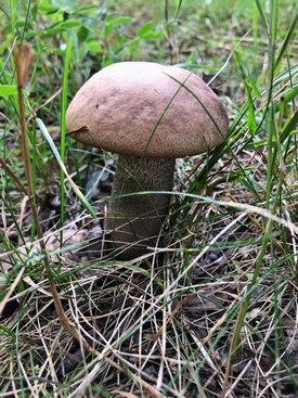 Foto: Ein einziger (links außen) von geschätzten knapp 40 Sommersteinpilzen, allesamt schon überständig, war für Stefan und Mia übrig geblieben. Ein klassischer Fall von verspäteter Pilzvisite. Zwei Flockenstielige Hexen und einige Pfifferlinge blieben zum Trost.