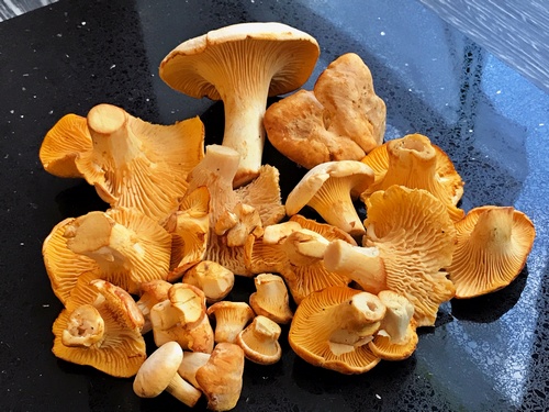Foto: Für eine Tour in einen unbekannten Wald ist dieser Fund von schönen Pfifferlingen nicht schlecht! Er passte genau in die Zeit, denn heute gibt es im Hause Stefan Semmelknödel. (Foto © Stefan)