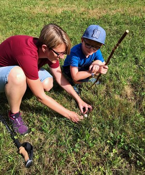 Foto rechts: Dani zeigt Lijan gerade einen der gefundenen jungen Champignons. Ein Zweiter ist auch noch auf dem Bild etwas versteckt, vorne rechts, der allerdings kaum zu sehen ist.