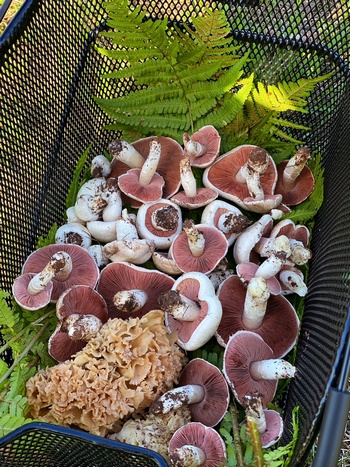 Ein paar Butterpilze, Pfefferröhrlinge und Goldröhrlinge fanden wir auch. In den dekorativ und zweckmäßig mit Farnkraut ausgelegten Fahrradkorb kam allerdings bis dahin nur eine Krause Glucke und auf dem Rückweg noch wunderschöne Wiesenchampignons, die sich auf einer Weide zahlreich mit Bovisten zusammengetan hatten (1. Foto rechts).