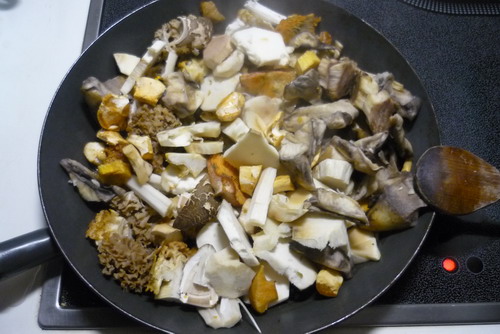 Meine Pfanne war eben randvoll mit einem schönen Mischpilzgericht, bestehend aus einer riesigen Rotkappe, einem schönen Birkenpilz, drei Steinpilzen, zwei Krausen Glucken, Semmelstoppelpilzen, Goldröhrlingen, Pfifferlingen, Reizkern sowie zwei ganz jungen Parasolpilzen.