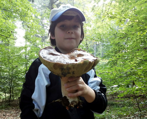 Foto: Ob Leslee solch einen Kameraden von Steinpilz so bald wieder findet? Stolz zeigt der auch auf dem Fußballplatz treffsichere Nachwuchspilzsammler seinen stattlichen Fund. Trotz seiner Größe war der Pilz tadellos.