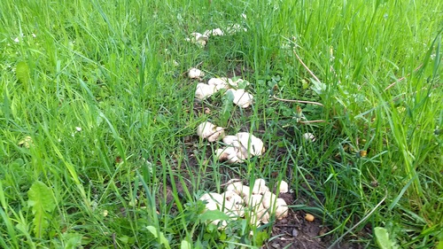 Foto: Die Maipilze sind nicht mehr zu bremsen, wachsen bei Eichenzell im Landkreis Fulda in wahren Massen, egal ob in Gruppen oder Reihen. (2 Fotos © Peter C.)