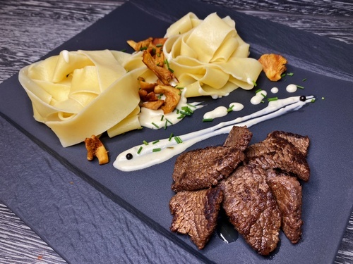 Foto: Streifen aus dem Metzgerstück, Pappardelle, eine feine Pfefferrahmsauce und, zur Krönung, die letzten Pfifferlinge des vergangenen Jahres. Stefan und Dani wollten einfach einmal wieder kulinarisch feiern. Und taten dies mit wie immer hohem Zubereitungsanspruch besonders bei Pfifferlingen. Jetzt wird es Zeit, dass sich die ersten frischen zeigen! (Foto © Stefan)