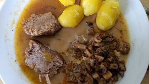 die restlichen frischen Speisemorcheln gab es heute zum Kalbsbraten: Morcheln, in Butter gebraten, mit Sahne u. etwas Weißwein abgelöscht und teilweise mit Bratensaft vermischt.