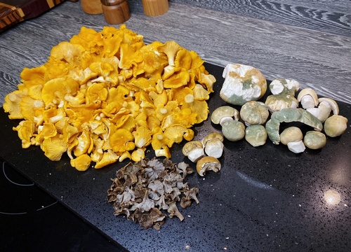 Foto: Zu einem erneut tollen Fund von Pfifferlingen und Grüngefelderten Täublingen kamen diesmal auch - erste - Krause Kraterellen hinzu. (2 Fotos © Stefan)
