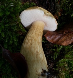 2 Fotos: Das leicht crèmefarbene Weiß hat der Elfenbeinröhrling durchgehend. Der Stiel ist von braunen Pünktchen überschuppt. Rechts ein Gallenröhrling, erkennbar an seinen fein rosa Röhren und seinem markanten braunen Netz auf braunem Grund.