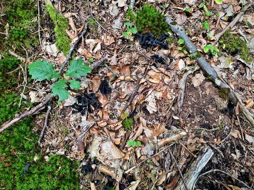 Foto: Vermutlich nur, weil die Fruchtkörper bereits kohlrabenschwarz waren, entdeckte Stefan diesen Platz der Totentrompeten. Jetzt hofft er auf ihren nächsten Schub.
