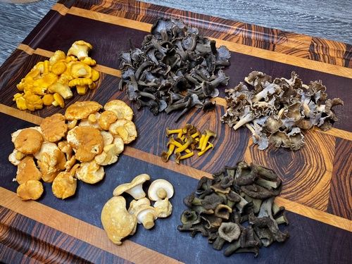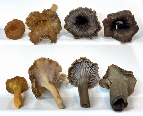 Foto: Vergleich der Pfifferlingsverwandten: Wir sehen (von links) Trompetenpfifferlinge, Krause Kraterellen, Graue Leistlinge und Totentrompeten (Herbsttrompeten).