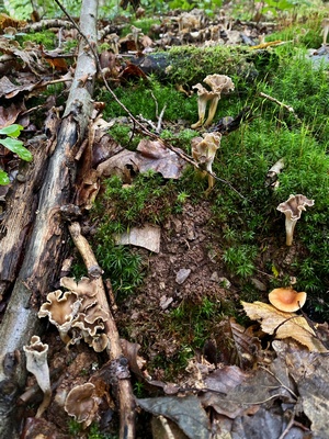 Auf dem weiteren Rückweg habe ich dann hier und da noch ein paar Pfifferlinge eingesammelt, die sich zu offensichtlich anboten. Auch ließen sich noch ein paar junge Gelbe Semmelstoppelpilze und Gelbstielige Trompetenpfifferlinge finden.