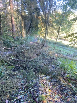 Die Wälder sehen nach dem Sturm sehr chaotisch aus. Überall Laubhaufen, umgestürzte Bäume und, vor allem, abgebrochene Äste (2. Foto rechts). All das war bei meinem heutigen Gang ein dauerhaftes Hindernis.