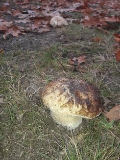 Wir haben dorthin mal einen anderen Weg genommen, an dessen Rand uns ein kleiner Steinpilz begrüßte. Zudem stolperte Dani durch Zufall über eine Stelle mit Grauen Leistlingen. Beides war uns herzlich willkommen und wurde natürlich mitgenommen.