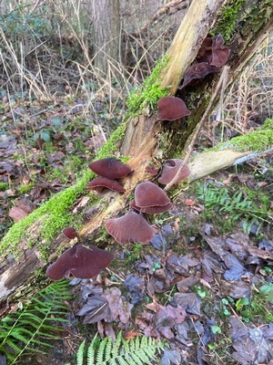 Als ich gerade an einer Fundstelle vorbeigelaufen war, machte mich Dorothee auf einen mit Winterrüblingen bewachsenen umgestürzten Buchenstamm aufmerksam. Sie wurden eingetütet. Die Pilze eigneten sich wegen ihrer schleimigen Hüte nicht für den Kapuzentransport.