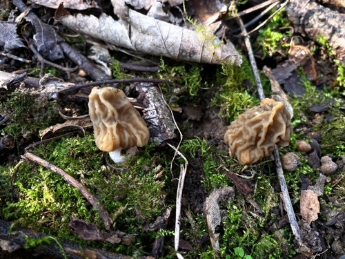 Foto: Zwei der jungen Böhmischen Verpeln. Diese frühe Pilzart zeigt auch Spitzmorchel-Plätze an; beide wachsen mitunter gemeinsam.
