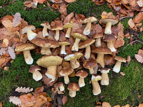 Foto: Wenn die Nachlese genauso gut ist wie die Ernte tags zuvor, ist jeder Pilzsammler glücklich. Tobias landete erneut einen Riesenschlag, holte am heutigen 26. November 2023 an die 30 weitere Steinpilze aus dem Wald bei Darmstadt-Eberstadt. Dann verdrehte er sich das Knie... (3 Fotos © Tobias)