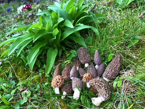 Foto: Links drei gelbliche Böhmische Verpeln, rechts eine Ansammlung von Spitzmorcheln, aufgenommen vor dem Bärlauchbüschel in Stefans Garten. Die überständigen Verpeln hat Stefan an Ort und Stelle verstreut, damit sie sich eventuell besser ausbreiten. (3 Fotos © Stefan)