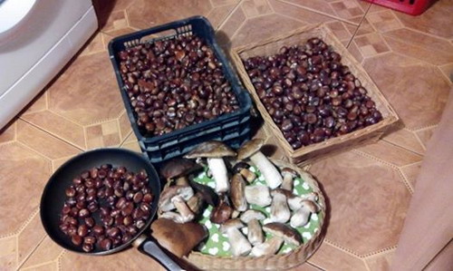 Foto: Schöne Esskastanaien (Maroni), zusammen mit Steinpilzen, Maronenröhrlingen, Flockigem Hexenröhrling und Perlpilzen. Da die Vorratskammer mit Pilzen bestens gefüllt ist, verschenkt Massimo seine derzeitigen Funde. Oder er tauscht sie im Naturalienhandel. (Foto © Massimo A.)