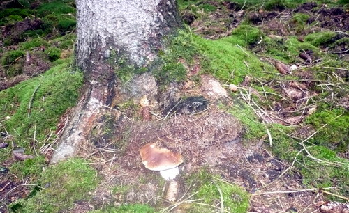 Foto: Ein Pilzfleck, der für sich spricht. Im Hintergrund sieht man, dass die Wildschweine den Moosboden aufgewühlt haben. Solche Streifen oder Stellen haben einen - leicht - "gestörten Bodencharakter" - Steinpilze lieben das! (3 Fotos © Jürgen S.)