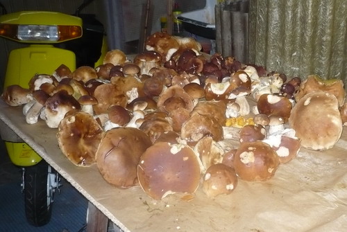 Der Wald steht voll mit Steinpilzen, Maronen, Anisegerlingen, Hallimasch und anderen Sorten. Ich habe auch ein paar Pfifferlinge gefunden, wenn auch kleine. Ansonsten: Steinpilze, Steinpilze, Steinpilze. Es waren wieder einmal über 100 Stück, die ich für ein Foto erneut auf die Platte gelegt habe, damit der Motorroller wieder was zu gucken hat. Die Maronen haben nicht mehr alle drauf gepasst. Es waren mehr als 130 Stück, allesamt klein und knackig.