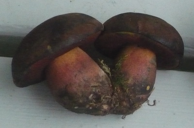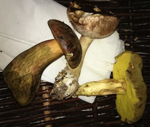 Foto rechts: Zwei wirklich prächtige Flockenstielige Hexenröhrlinge im Bestzustand hat Jürgen gefunden. Die vor allem in Süddeutschland auch "Schusterpilze" genannten Dickröhrlinge zählen zu den schmackhaftesten Röhrlingen. Nicht wenige Kenner schätzen sie höher ein als Steinpilze.