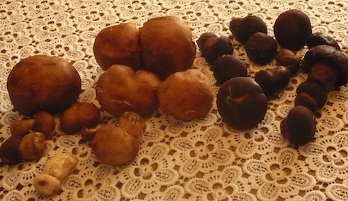 Foto: Links, mit den helleren Hüten, liegen die Steinpilze, rechts die Schusterpilze. Damit machte Jürgen in diesem Jahr die bislang beste Röhrlingsernte. Sie zeigt uns, dass die Steinpilze da sind! Gratulation zu diesem tollen Fund! (2 Fotos © Jürgen S.)