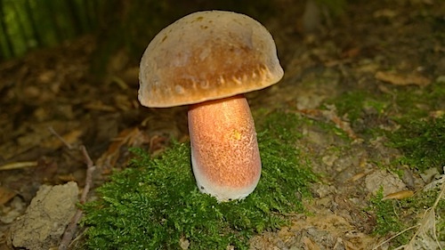 Foto: Er steht da wie eine Eins! Ein Flockenstieliger Hexenröhrling, dessen flockiges Stielmuster hier gut erkennbar ist.