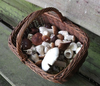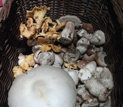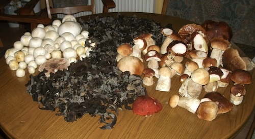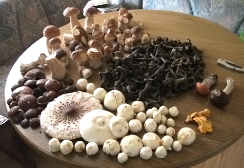 Foto: Jeden Tag ist er draußen - und jeden Tag macht er seine Ernte. Wieder hat Jürgen, wie zu sehen, seine üblichen Pilze gefunden: Zu Steinpilzen, Anisegerlingen und Maronen gesellen sich Pfifferlinge, Birkenpilz, Rotkappe - Herbsttrompeten.