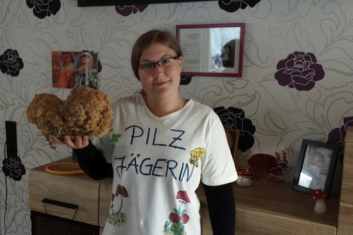 Foto: Da war die ausgewiesene Pilzjägerin Sarah, hier in ihrem schönen, offenbar selbst gefertigten T-Shirt, aber wirklich erfolgreich. Denn diese Krause Glucke kann sich sehen lassen: Größe und Zustand sind augenscheinlich spitze! (Foto © Fam. L./Privat)