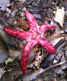 2 Fotos: Beinahe kopfgroß sind, wie man sieht, derzeit die Pfifferlinge im Taunus. Sie wiegen bis zu 100 Gramm pro Stück. Rechts der bizarre Pilz ist ein Eingeschlichener: Die Sporen des Tintenfischpilzes gelangten 1938 wohl mit einer Holzlieferung aus Australien nach Deutschland. Heute hat er sich stark ausgebreitet und ist keine Seltenheit mehr. Dass er nicht in der Pfanne landet, versteht sich bei seinem Anblick von selbst. Mehr als wir Menschen mögen ihn wohl Kameraobjekive.