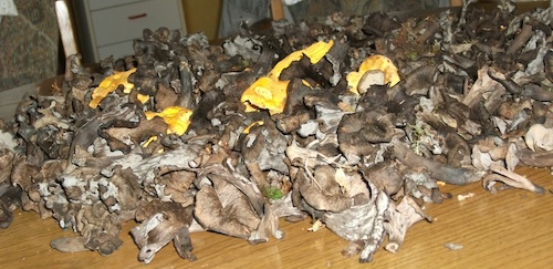 Foto: Hallimasch hat Jürgen noch nicht mitgenommen. Er bevorzugte Steinpilze, Maronen und Anisegerlinge. Die Herbsttrompeten im Vordergrund sind bereits getrocknet. (2 Fotos © Jürgen)