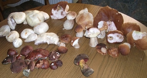 Foto: Und ob das für ein zünftiges Abendbrot reicht! Jürgens heutiger Fund mit Steinpilzen, Maronen, Anisegerlingen und einem bunten Netzstieligen Gesellen.